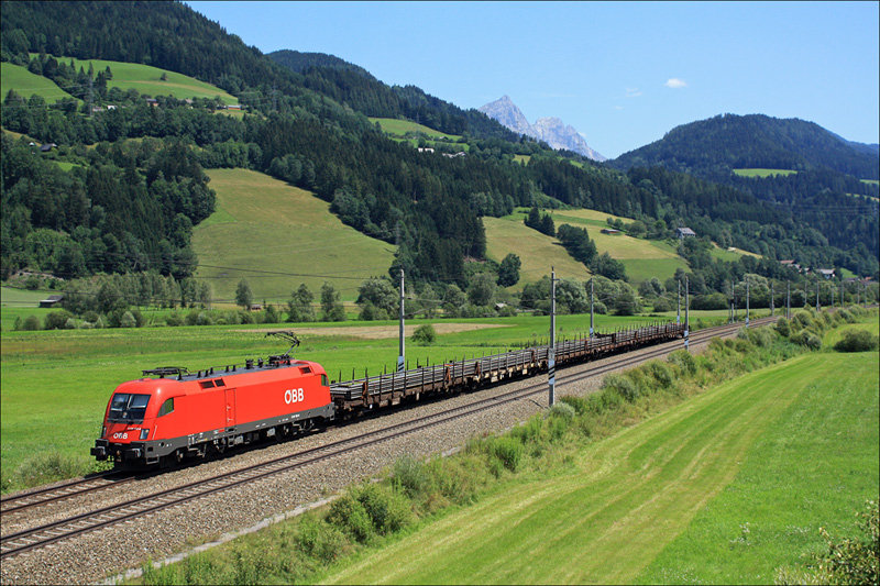 1116 132 mit einem Bedarfszug nahe Rottenmann in Richtung Selzthal. 17.07.2009 (zum Bild)