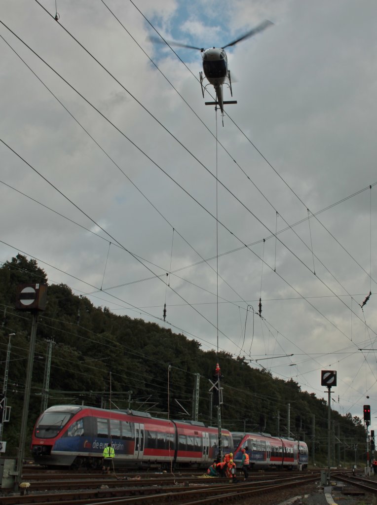 Vielen Dank für eure Kommentare und das Interesse an den Hubschrauberbildern. Es sind dort in der Tat KS-Signale gestzt worden. Wie Kay schon schrieb es es nicht so ungewöhnlich das Signale oder Masten bei der Bahn mit Helicopter unter "laufendem Rad" verbaut werden. Es ist nur eine Rechenaufgabe der Bahn, wenn es genügend Lastflüge für den Heli gibt ist es einfach billiger. Die Fahrgäste in dem Talent haben natürlich schon gestaunt was da auf dem Nachbargleis abging.
