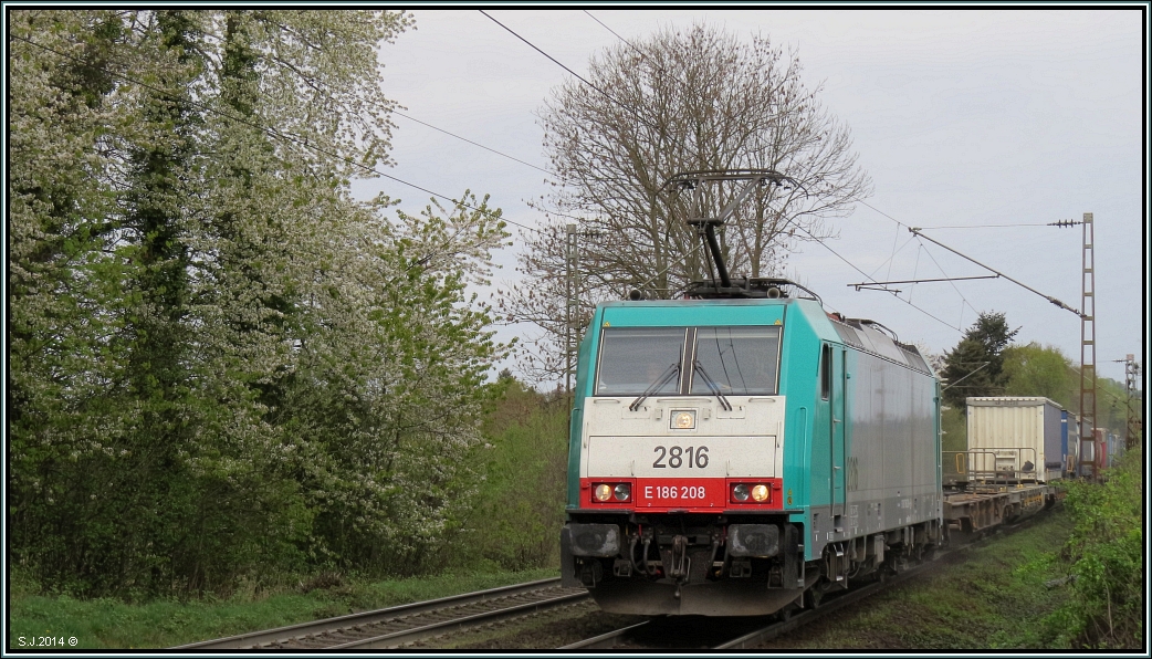 Fliederduft liegt in der Luft am Gemmenicher Weg bei Aachen. Eine belgische Cobra (E-186) ist gerade mit einen Containerzug unterwegs nach Antwerpen.Bildlich festgehalten Anfang April 2014 an der Montzenroute. (naar de afbeelding)