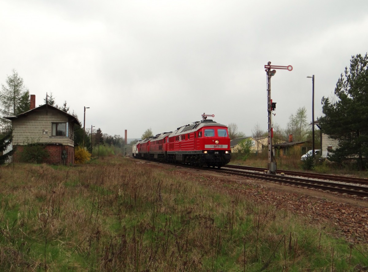 Am 14.04.14 holte die MEG 318 (232 690) wieder einen Lokzug von Saalfeld nach Chemnitz. Es waren dabei 232 694-0, 232 229-5 und 232 146-1 hier die Einfahrt in Pößneck. (zum Bild)