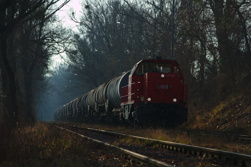 Gegenlichtaufnahme der 2070 086, die am frühen Morgen in Richtung Wien Lobau Hafen fährt. (11.03.2014) (zum Bild)
