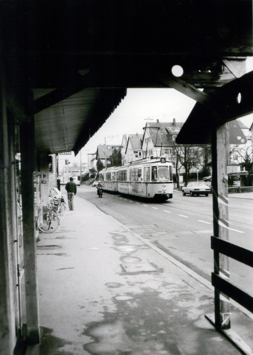 Als noch keine Ampel stand (die hatte einst die EU finanziert, als sie noch EG hiess), war links etwa beim hinteren Ende eine Bude aufgestellt, worin ein Wächter seinen Dienst tat. Der regelte den Verkehr und die entgegenkommenden Strassenbahnen. Insgesamt 5 solche Buden waren aufgestellt für die Bereiche mit den Gleisverschwenkungen.