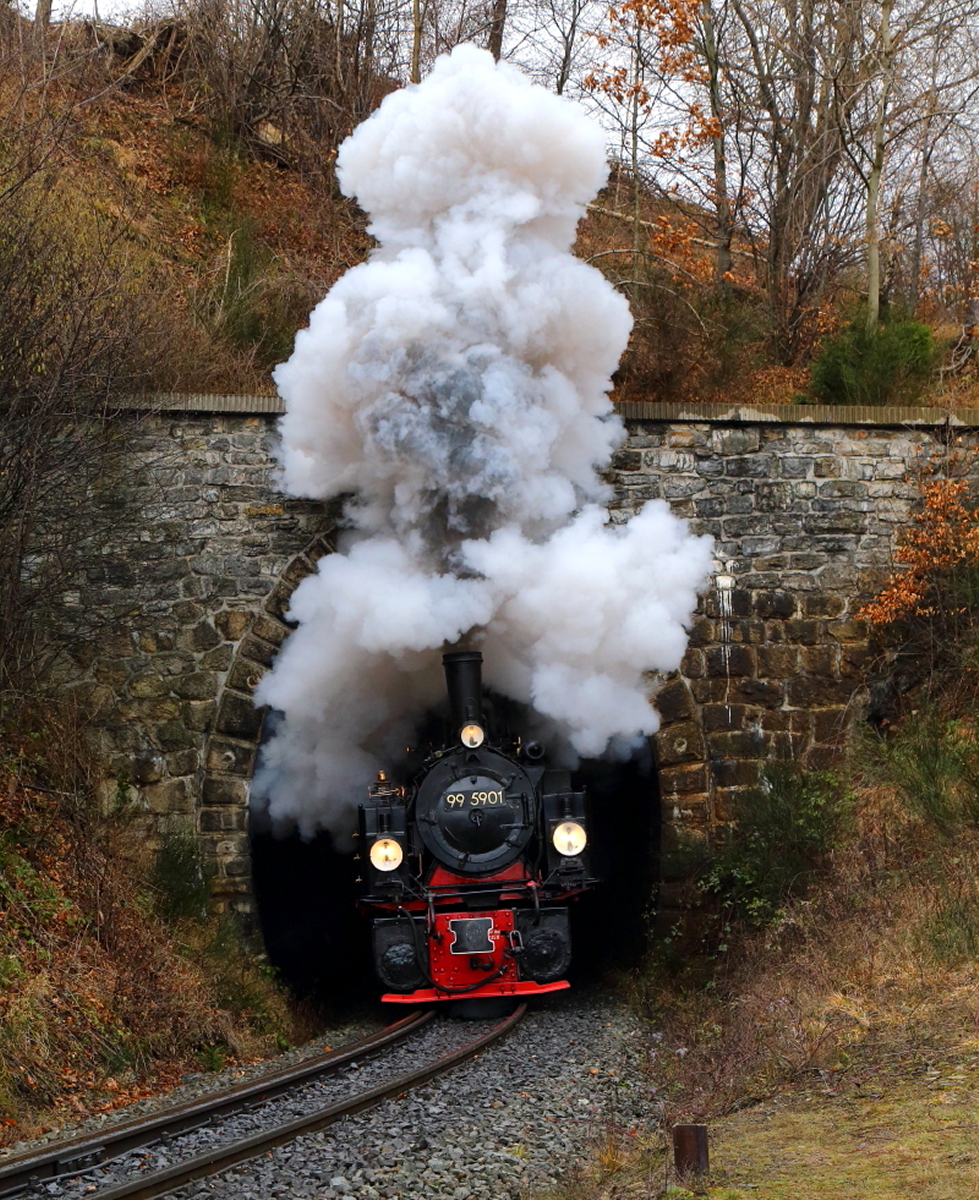 Ausfahrt (Scheinanfahrt) von 99 5901 mit IG HSB-Sonderzug am 05.02.2016 aus dem Thumkuhlental-Tunnel. (Bild 4) Bei genauem Hinsehen wird in der Dampfwolke, etwas Phantasie vorausgesetzt, die Figur eines sitzenden Teddybären sichtbar! ;-) (alla foto)