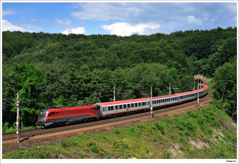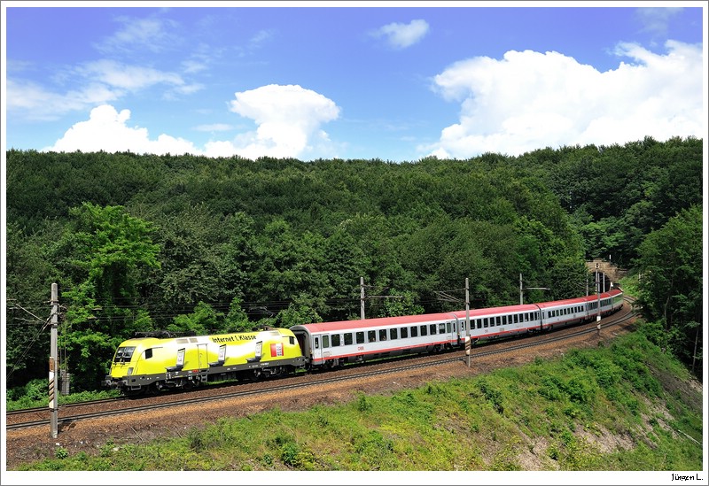 Jetzt war ich auch mal an der neuen Fotostelle an der Westbahn. Kann mich aber noch nicht so richtig für einen Bildausschnitt entscheiden. Mir gefallen irgendwie alle drei Versionen. 1116.033 (Telekom) mit dem OEC 642. Eichgraben, 21.6.2009. (voir l'image)