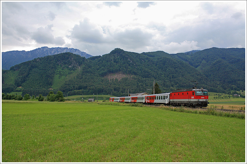 Doppeltraktion in Form von 1116.128 und 1116.256 vor einem Röhrenganzzug gen Süden - aufgenommen am 21. Juni 2009 nahe des Bahnhofes Micheldorf an der Pyhrnbahn. (voir l'image)