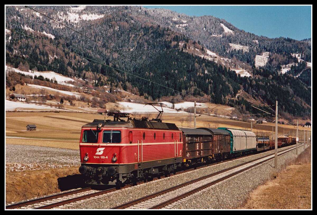 1044 119 ist mit G53507 (Ferngüterzug von Wien Zvbf. nach Villach Süd) im Murtal unterwegs und erreicht in Kürze den Bahnhof Unzmarkt. Das Bild entstand am 27.02.2001. (alla foto)