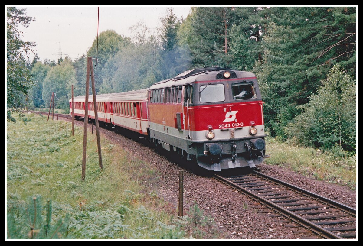 2043 012 ist am 8.08.2002 mit R4548 (Wolfsberg - Klagenfurt)im Jaunfeld bei Mittlern unterwegs. Im diesen Streckenabschnitt verläuft die Strecke meist im tiefen Wald. (alla foto)