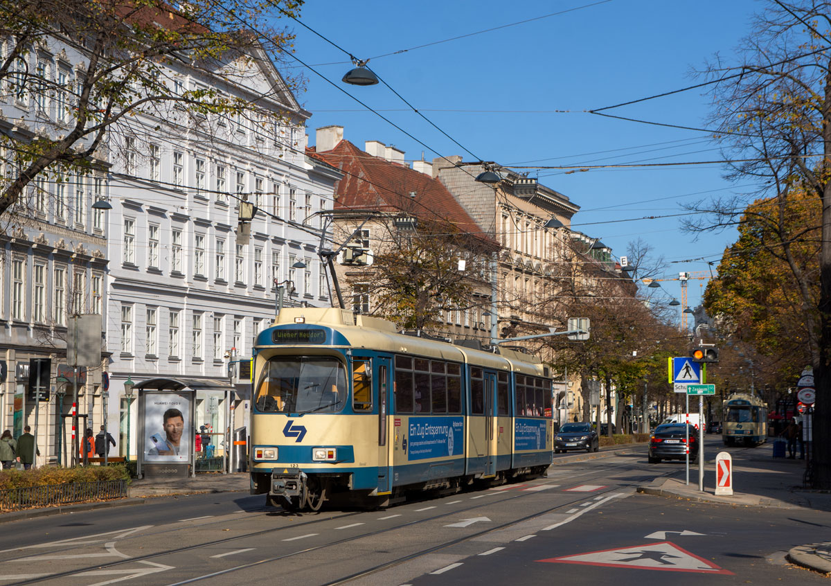 Wien WLB TW 123 nach Wiener Neudorf, Mayerhofgasse, 06.11.2021. (zum Bild)
