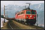 1042 028 bringt gemeinsam mit 1116 172 einen Güterzug über die Nordrampe des Semmerings. Das Bild entstand kurz vor dem Bahnhof Eichberg am 13.03.2004. Damals gab es noch Linksverkehr auf der Semmeringbahn, seit ca. zwei Jahren wurde das auf Rechtsverkehr geändert. (zum Bild)