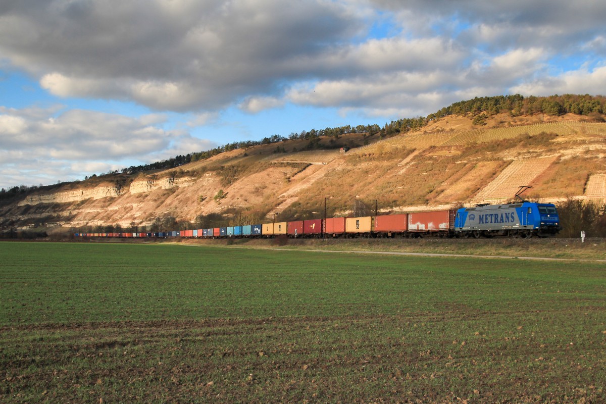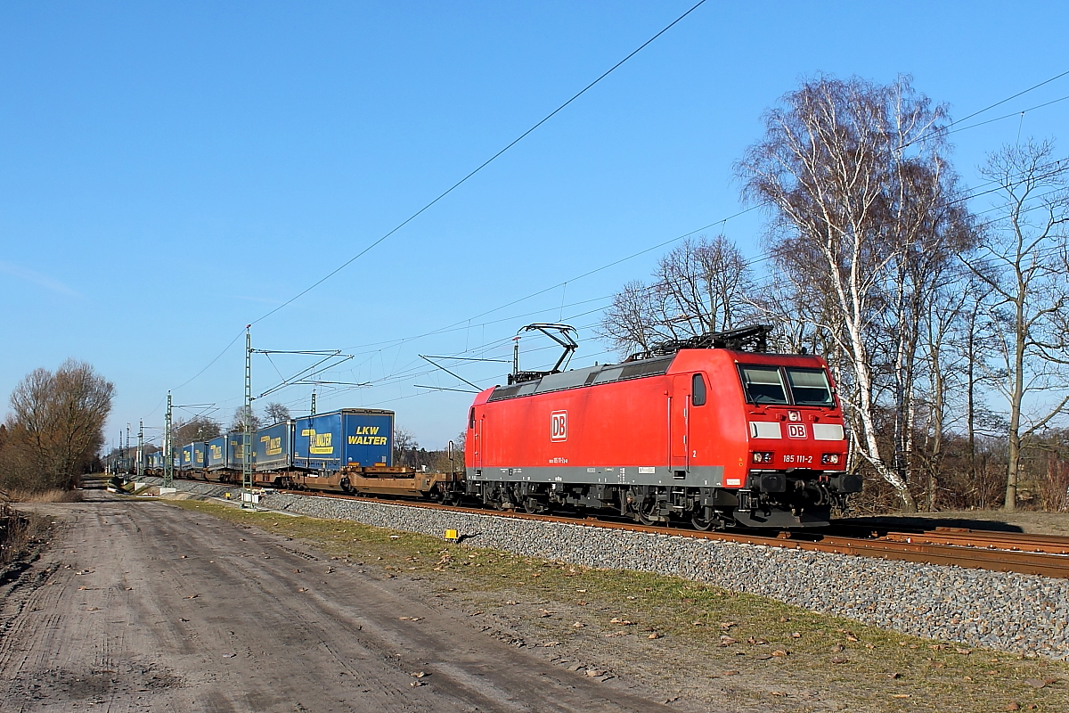 ein wunderschönes Bild von der 185 111-2 mit dem Taschenwagenzug.