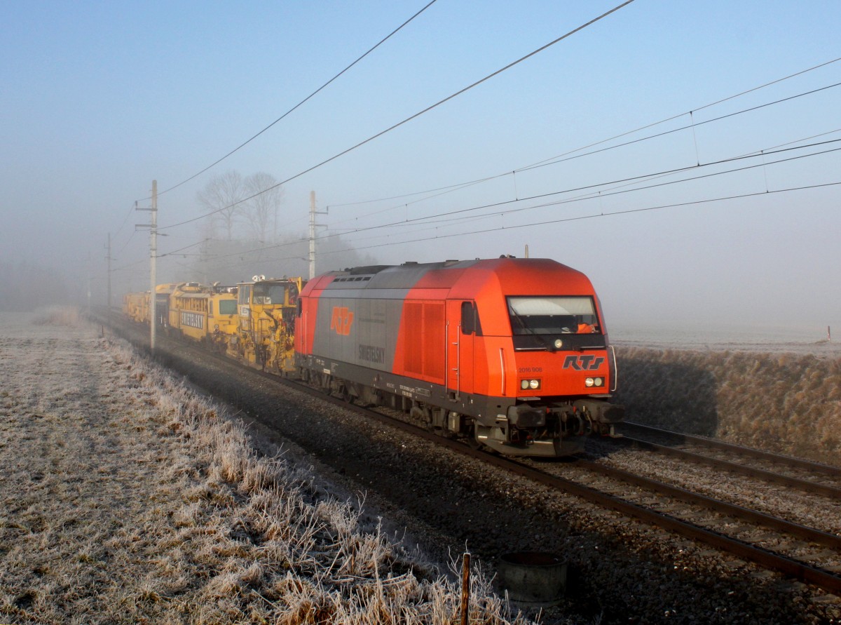 Nebel, Rauhreif und die morgendliche Sonne schaffen mit den Farben des Zugs ein schönes Bild!