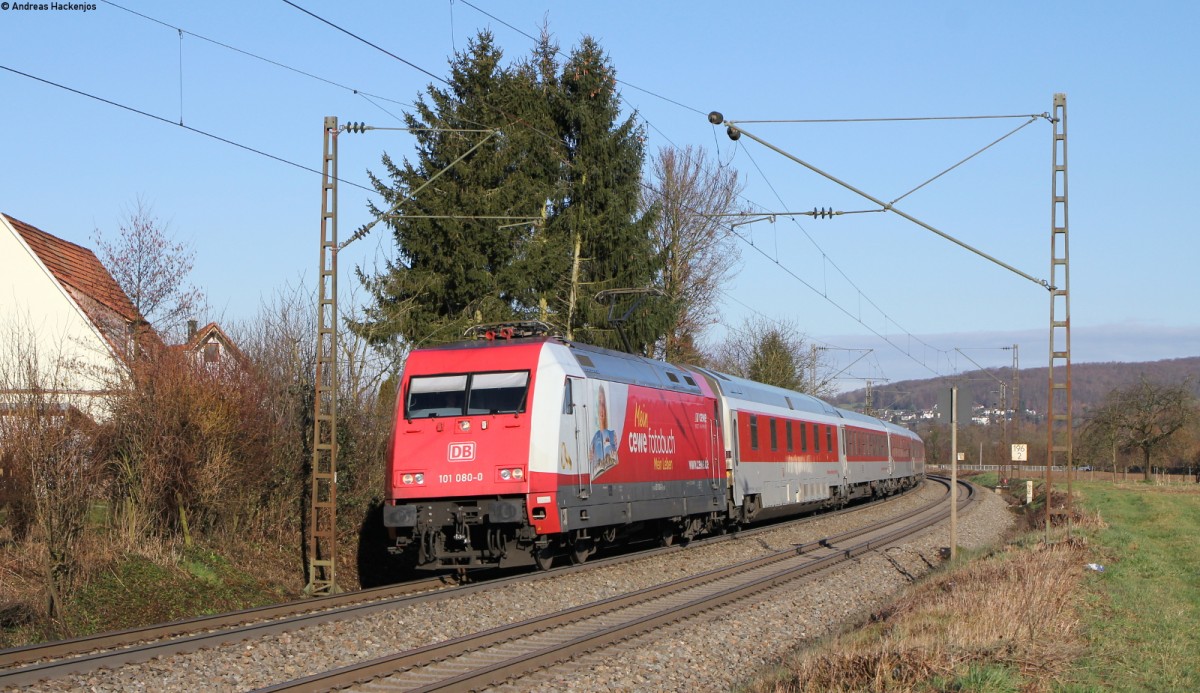 101 080-0 "CEWE" mit dem CNL 473 (Koebenhavn H-Basel SBB) bei Kollmarsreute 20.2.14 (zum Bild)
