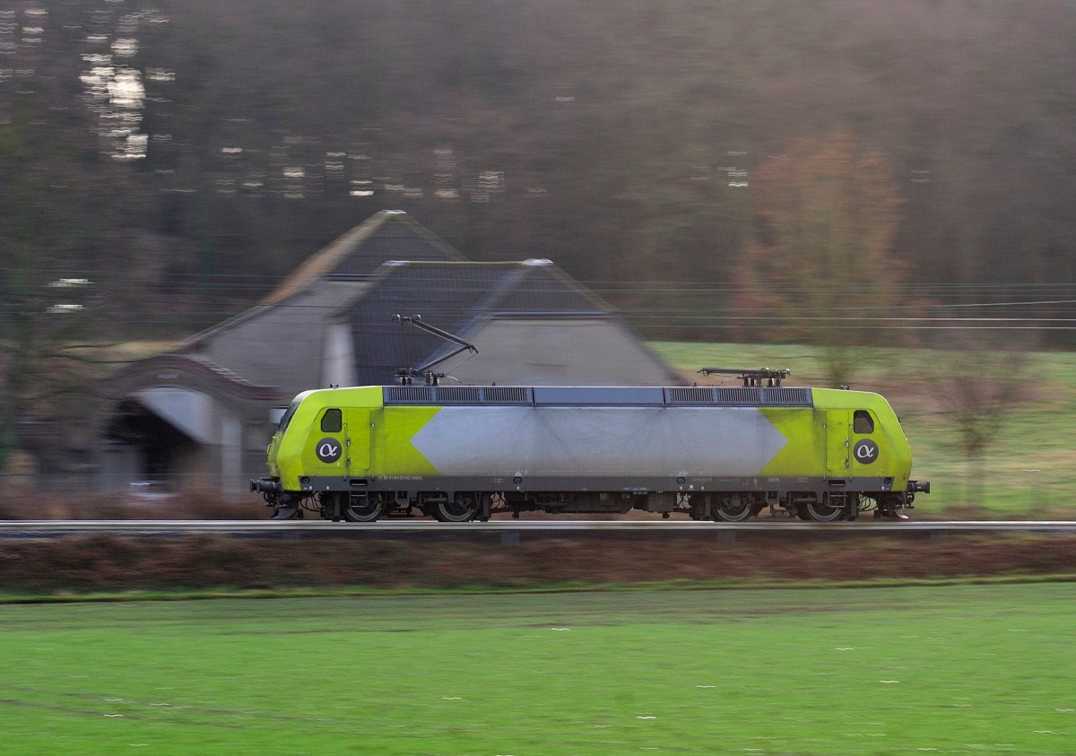 Mitzieher (Panning) von Alphatrains/Crossrail 145-Cl 031/145 103-8 im Morgendunst des 21.2.2014. KBS 485 bei Km 21,6 (Rimburg) Übach-Palenberg in Richtung Aachen unterwegs. (zum Bild)