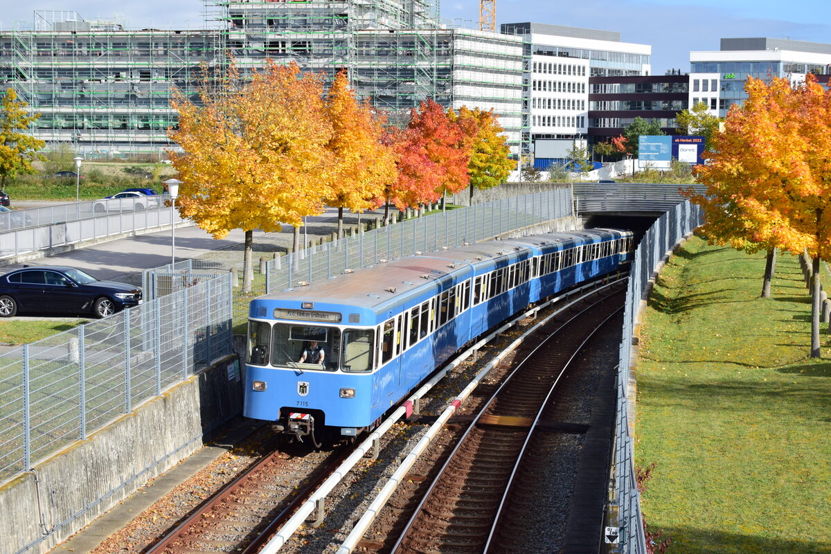 7115 der Baureihe A hat soeben den unterirdischen Teil in Garching verlassen und erreicht Garching Hochbrück. Garching 23.10.2021 (zum Bild)