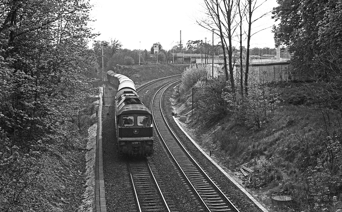Nochmal Kohlhasenbrück im Mai 1988, mit Blick in Richtung Griebnitzsee: Der kurze Güterzug mit 132 610 kommt über die Güterstrecke aus Richtung Seddin. (zum Bild)