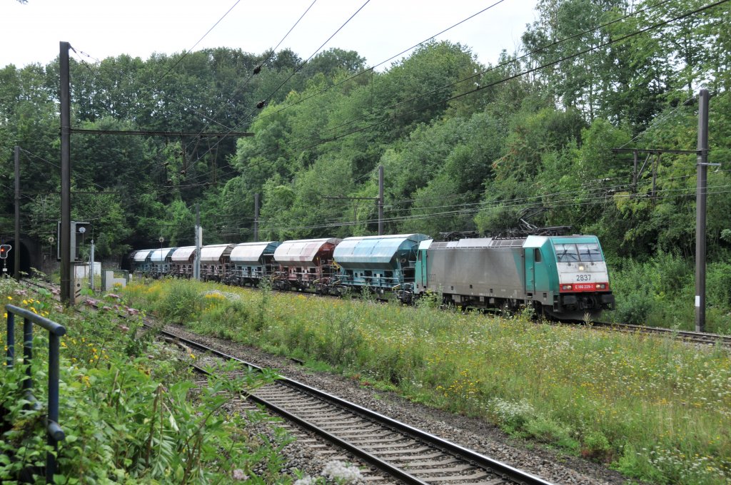 Cobra-Lok 2837 verlässt hier mit ihrem Güterzug den Tunnel von Veurs, der aus zwei Röhren besteht, und wird in wenigen Kilometern den Bhf Montzen erreichen. Die Aufnahme entstand am 12/08/2011. (zum Bild)