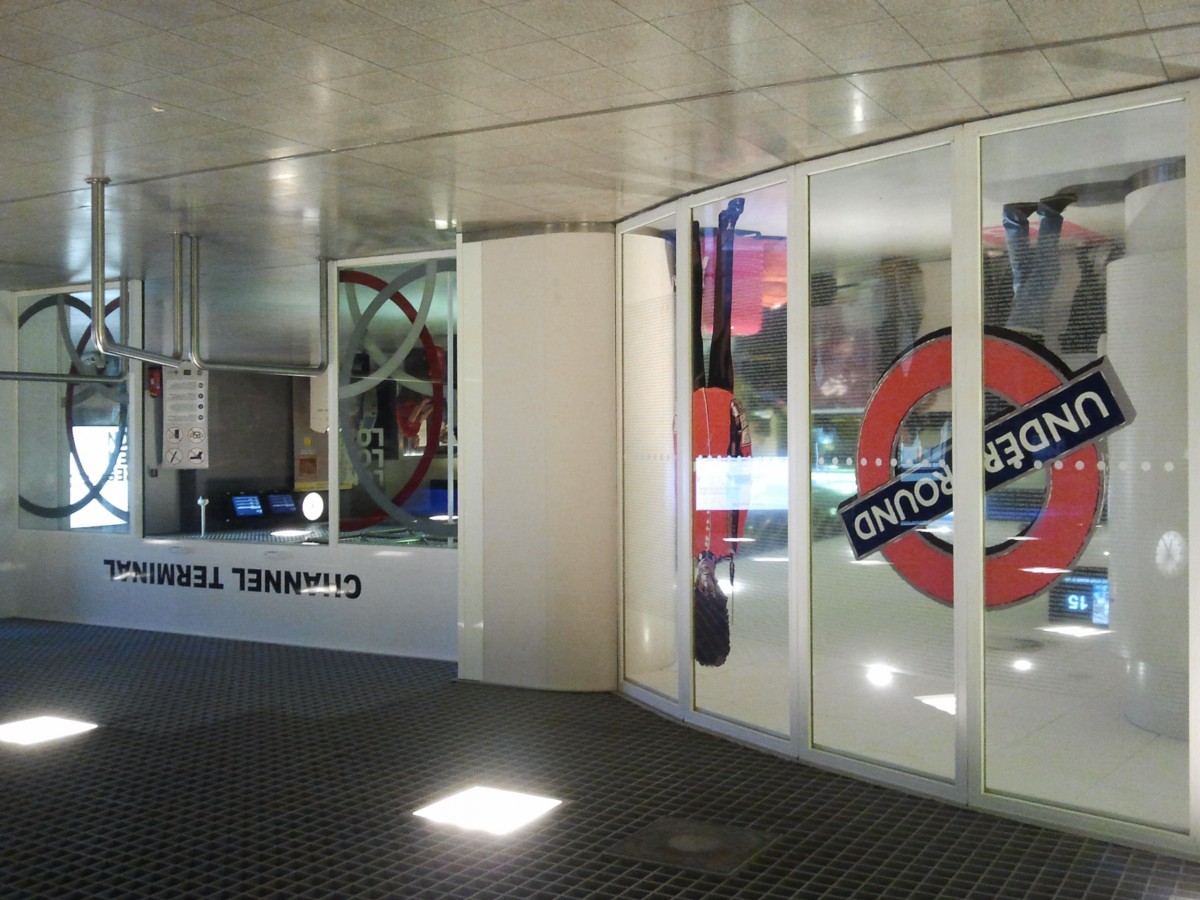 Ansicht des linken Eingangsbereiches zum Eurostar. Um zu den Zügen des Eurostar zu gelangen, muss man zunächst sein Ticket vorzeigen und auch seine Sitzplatzkarte. Erst dann wird man zu den Zollschaltern durchgelassen, denn GB liegt nicht im Schengen-Raum. Die dritte Stufe ist der obligatorische Scan des Gepäcks und jeder Person auf metallische Gegenstände hin. Brüssel-Midi, der 29.9.2013 (zum Bild)