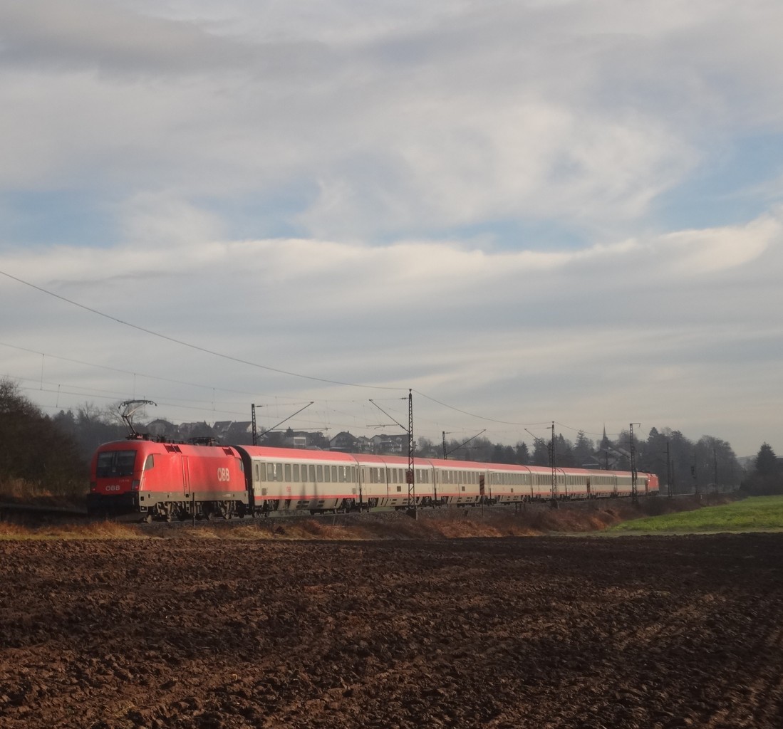 Zwei 1116er bringen den EC113 von Frankfurt nach Klagenfurt, hier bei Ebersbach, Januar 2014. (zum Bild)