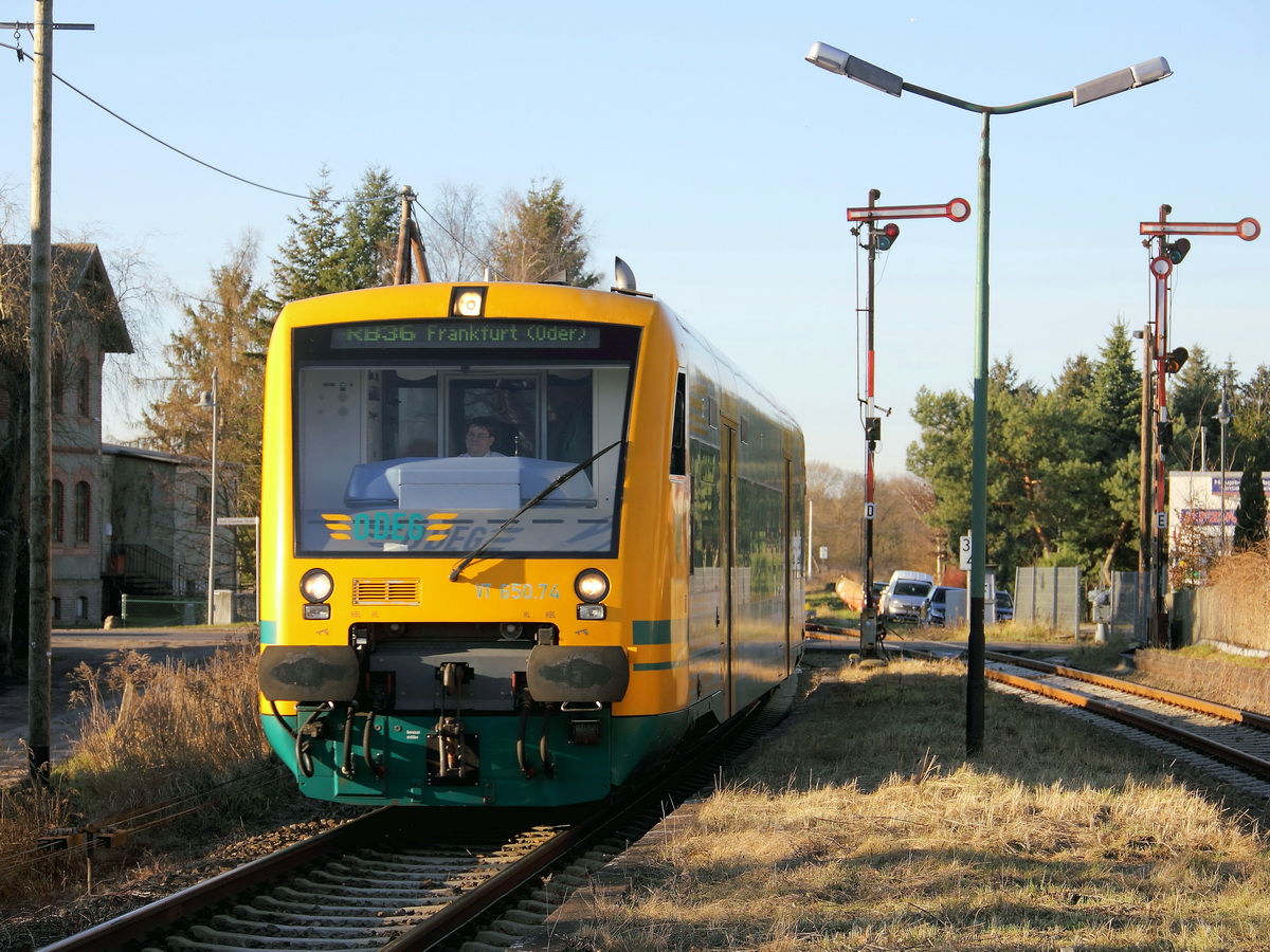 VT 650.74 der Ostdeutsche Eisenbahn GmbH bei der Einfahrt in den Bahnhof Storkow(Mark) als RB 36 (RB 79633) nach Frankfurt Oder am 30. Dezember 2013. (naar de afbeelding)