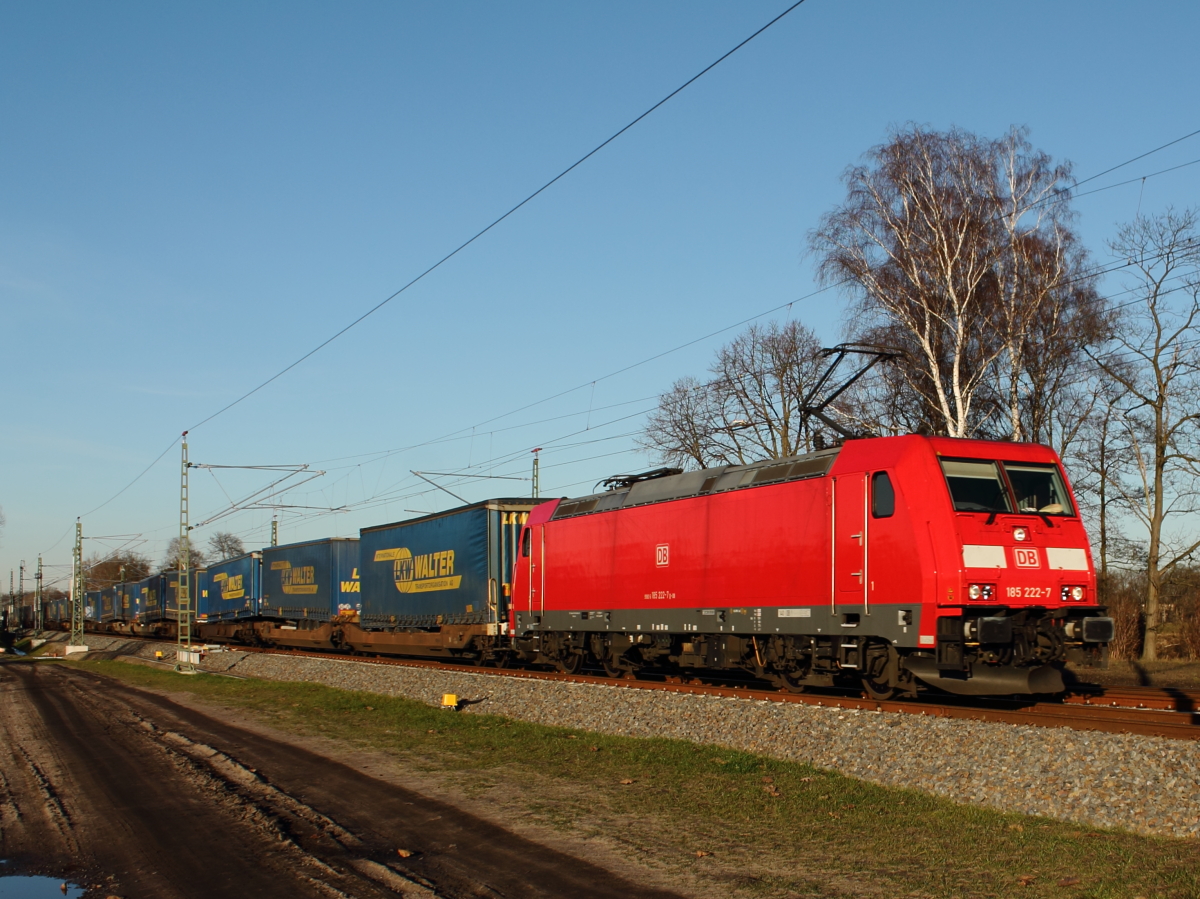 Das alte Jahr zeigt sich am letzten Tag noch einmal von der besten Seite. Allen einen guten Rutsch und ein frohes und gesundes Jahr 2014. Die 185 222-7 mit LKW-Walter Aufliegern bei der Durchfahrt am 31.12.2013 in Nassenheide. (zum Bild)