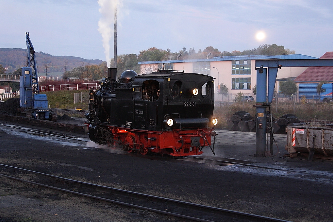 99 6101 am Morgen des 19.10.2013 bei der Ausfahrt aus dem Bw Wernigerode zur Übernahme eines Sonderzuges der IG HSB. Sie befindet sich hier gerade in Höhe der Bekohlungs- und Entaschungsanlage. Auch der Mond scheint sich diese Szene nicht entgehen lassen zu wollen und geht ein wenig später erst schlafen! ;-) (zum Bild)