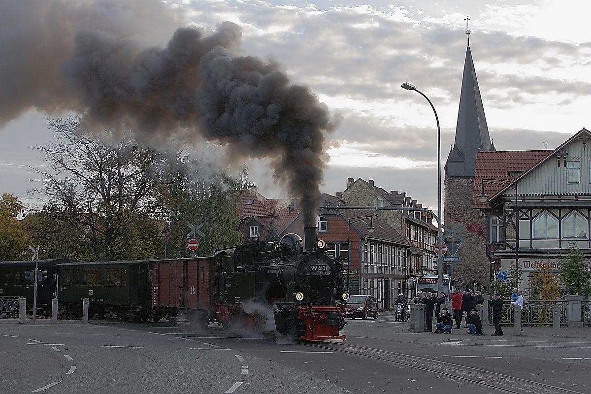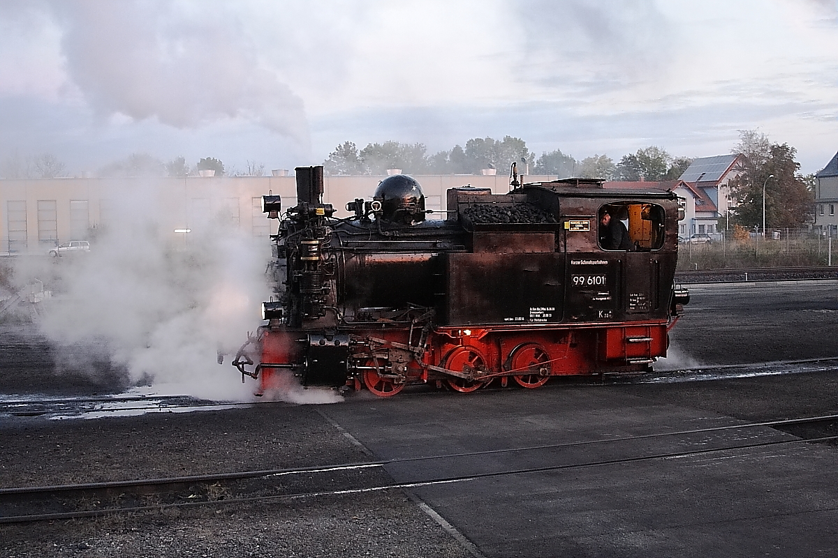 Mit mächtiger Qualmwolke fährt 99 6101 am Morgen des 19.10.2013 in den Bahnhof Wernigerode ein, um einen Sonderzug der IG HSB nach Eisfelder Talmühle zu übernehmen. (zum Bild)