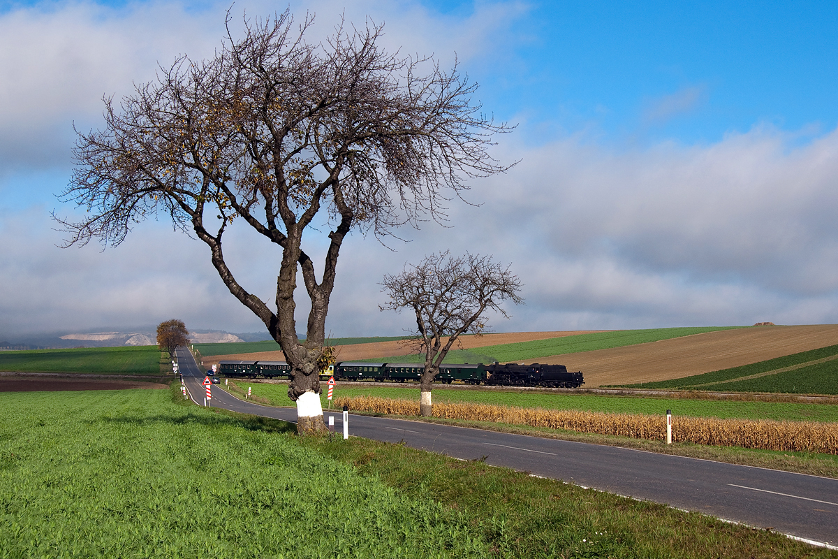 Herbstliche Farben, schöne Maschine, schöne Perspektive, selbst die kleinen Blumen rechts im Bild, das alles gefällt mir sehr gut.