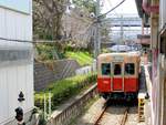 Hanshin Konzern, Mukogawa-Linie: Diese kurze Linie zweigt unterwegs ab und führt 1,7 km in eine mit Wohnsilos dicht überbaute Siedlung im Industriegebiet nahe am Meer. In Mukogawa wartet Zug 7864/7964 (Serie 7861; 3 Zweiwagenzüge von 1966/68, 2020 durch Züge der Serie 5500 ersetzt), 22.März 2014. (naar de afbeelding)