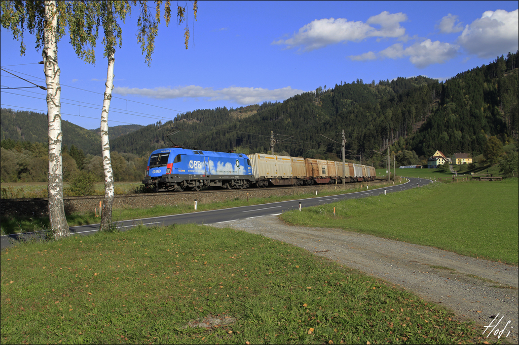 Neben der schönen Werbelok gefällt auch der Kontrast zwischen der modernen Fahrleitung und den (Bahnfremden)-Holzmasten.