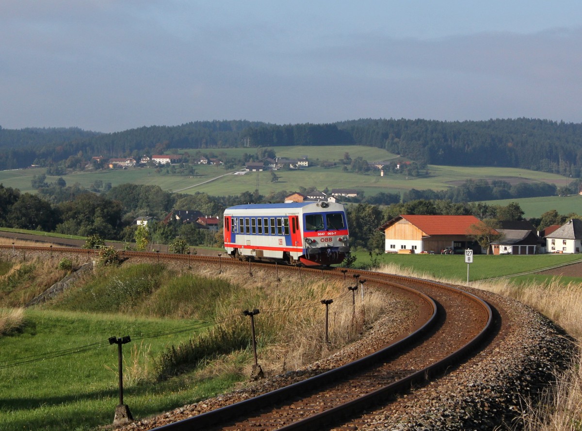 STLB Triebwagen 2 fährt als R 8607 von Feldbach nach Bad Gleichenberg. Oedt bei Feldbach 4.10.2013 (zum Bild)