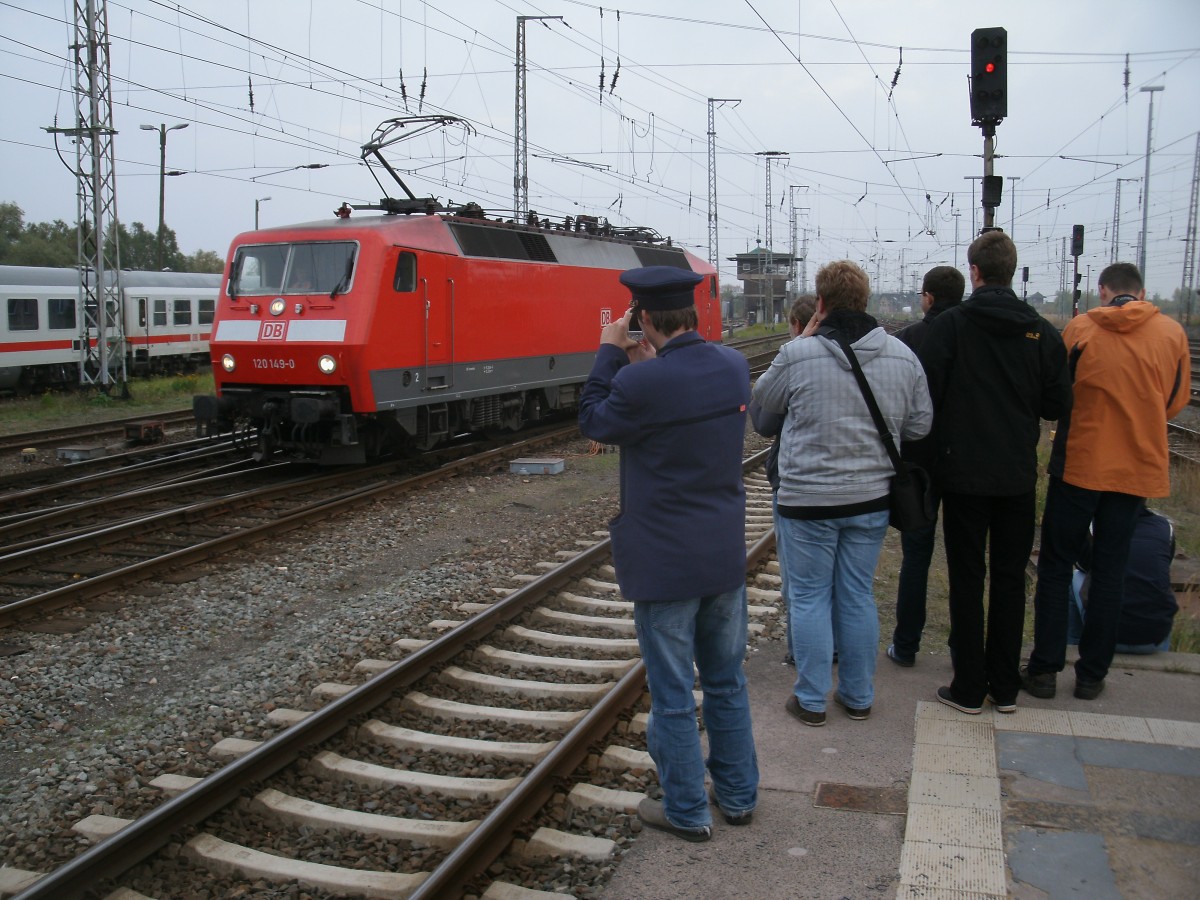Selbst bei der Vorbeifahrt von 120 148,am 12.Oktober 2013,in Stralsund kamen die Fotoapparate zum Einsatz. (zum Bild)