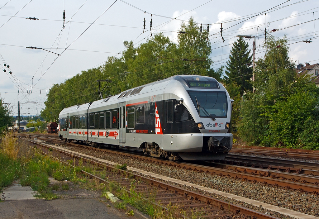 ET 220008 der Abellio Rail NRW GmbH ein kurzer FLIRT (2-teilig) mit Werbung "150 Jahre Ruhr-Sieg-Strecke", rauscht am 29.08.2013 als RB 91 Ruhr-Sieg-Bahn von Kreuztal weiter in Richtung Siegen. (zum Bild)