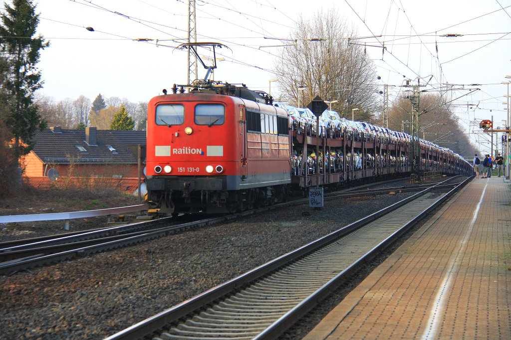 151 131-0 von Railion kommt mit einem Autozug aus Richtung Herzogenrath nach Aachen-West und fährt die Kohlscheider-Rampe hoch. Aufgenommen bei der durchfahrt in Kohlscheid bei Abendsonne am 27.3.2012. (zum Bild)