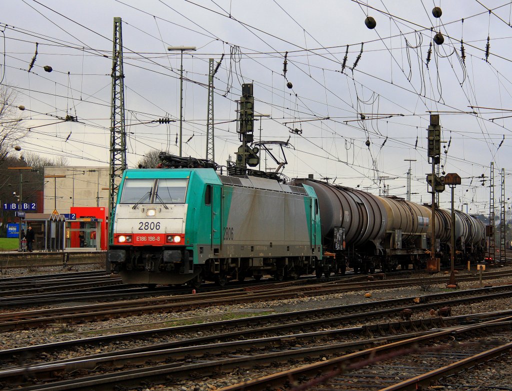 Die Cobra 2806 fährt mit einem Kesselzug aus Ludwigshafen-BASF nach Antwerpen-BASF bei der Ausfahrt von Aachen-West am 22.1.2012. (zum Bild)