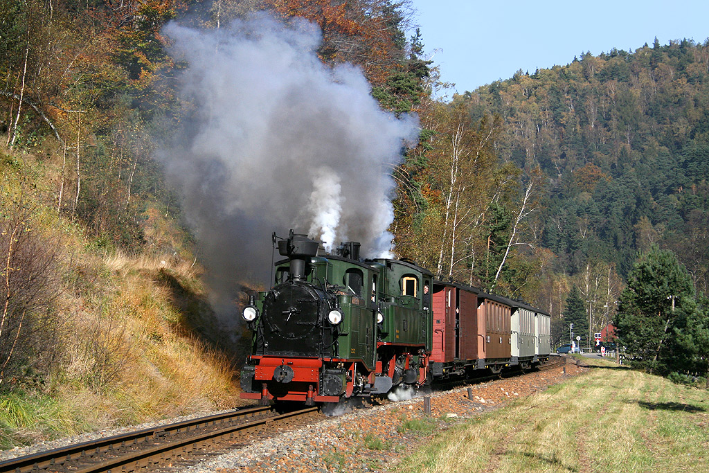 I K Saxon No54 + IV K 145 (DR 99 555) Teufelsmühle - Kurort Oybin (17.10.2010) (zum Bild)