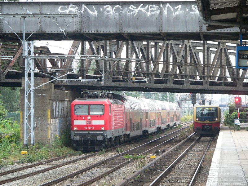 Parallelfahrt von 112 187-0 mit dem RE1 nach Frankfurt (Oder) und einer S-Bahn der BR 481 auf der Linie S3 nach Erkner. Im Ostkreuz. 12.8.2007 (zum Bild)