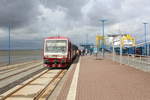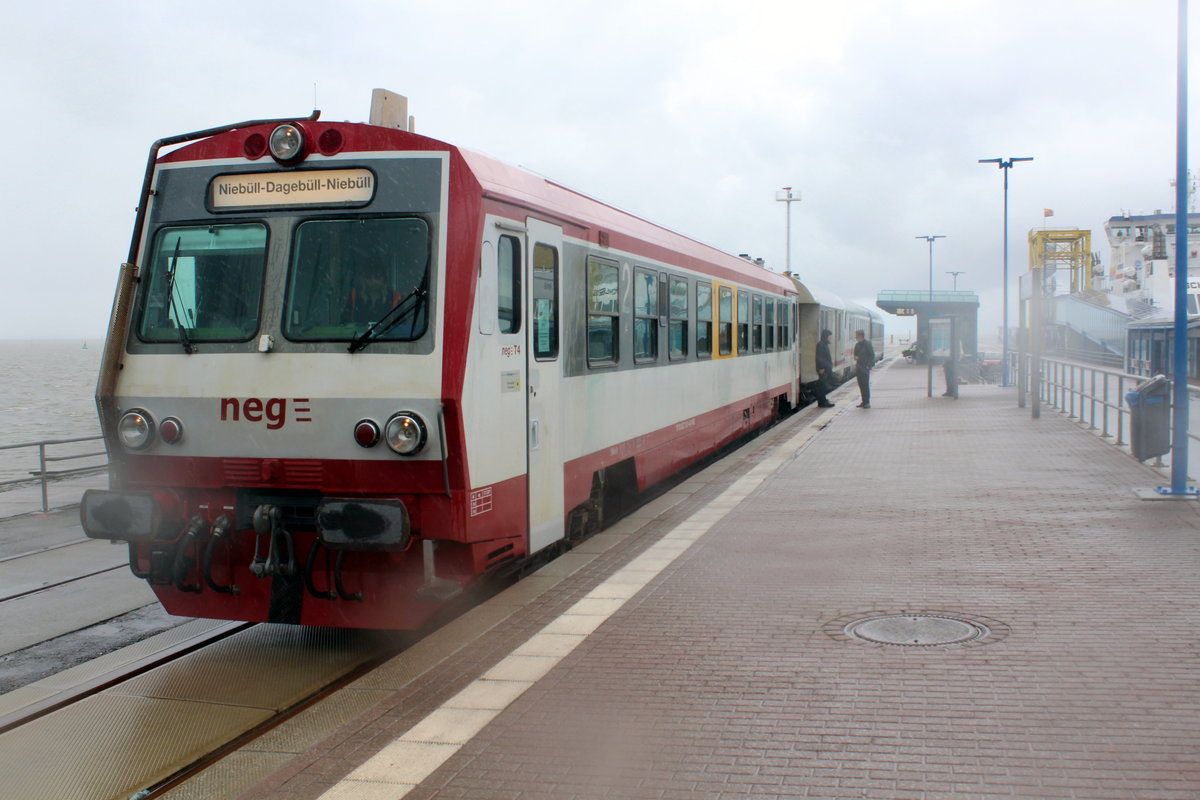 Norddeutsche Eisenbahngesellschaft (NEG): VT 505+506 Dagebüll Mole am 7. Juli 2020, einem Tag mit ein bisschen Sonne, starkem Wind und viel Regen. - Von Dagebüll (nordfriesisch: Doogebel, dänisch: Dagebøl) gibt es Fährverbindungen zu den Wattenmeerinseln Föhr (dänisch: Før) und Amrum. (zum Bild)