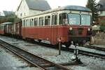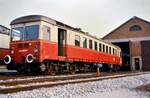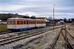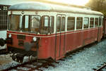 VS 150 vor dem Lokschuppen Laichingen. In Wirklichkeit war VS 150 aber nur ein Beiwagen, er hätte daher auch richtigerweise VB 150 genannt werden sollen. Er stammte von der Härtsfeldbahn. 1963 fabrikneu von Auwärter (?) geliefert, sollte er zu Zeiten besonders vieler Fahrgäste zusammen mit T 30 und T 31 WEG auf der Härtsfeldbahn als Steuerwagen eingesetzt werden. Daraus wurde aber nichts, der Umbau zum Steuerwagen wurde nie komplettiert. Nach seiner Zeit bei der Härtsfeldbahn, welche eine der wenigen Bahnlinien der Württembergischen Nebenbahnen (WN) gewesen war, gelangte er zur WEG-Nebenbahn Amstetten-Laichingen, wo der Umbau zum Steuerwagen ebenfalls nicht komplettiert wurde. Die WEG (Württembergische Eisenbahngesellschaft) hatte ihre Schmalspurbahn zwischen Amstetten und Laichingen (mit einer Spurweite von 1000 mm) 1985 schon längst abgeschrieben, und hiervon erzählte auch der dort abgestellte VS 150. Datum: 13.04.1985 (alla foto)