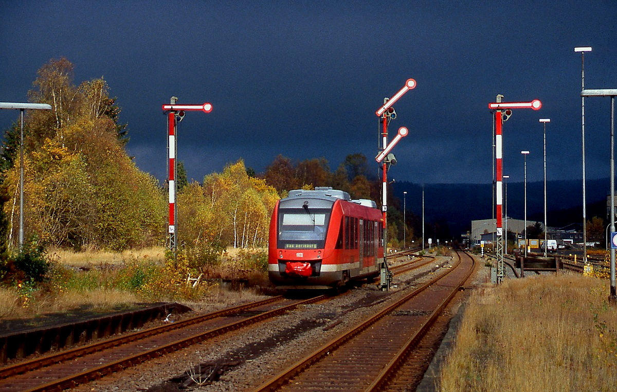 Für wenige Minuten herrschte an einem Spätseptembertag 2004 eine seltsame Lichtstimmung im Bahnhof Erndtebrück. Glücklicherweise verließ ein 640 genau zum richtigen Zeitpunkt den Bahnhof in Richtung Bad Berleburg. (zum Bild)