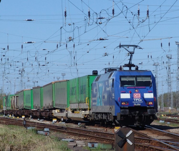 Die von der TX Logistik angemietete ES 64 U2-011 hatte am 17.06.09 die Ehre den DGS 43141 nach Verona zu bringen. Hier Durchfährt der KLV-Zug die südliche Bahnhofsausfahrt von Bad Oldesloe und wird seine Reise über Hamburg und den Alpen nach Norditalien fortsetzten. (naar de afbeelding)