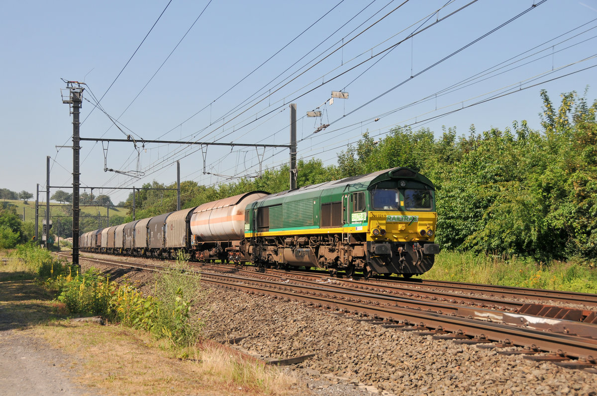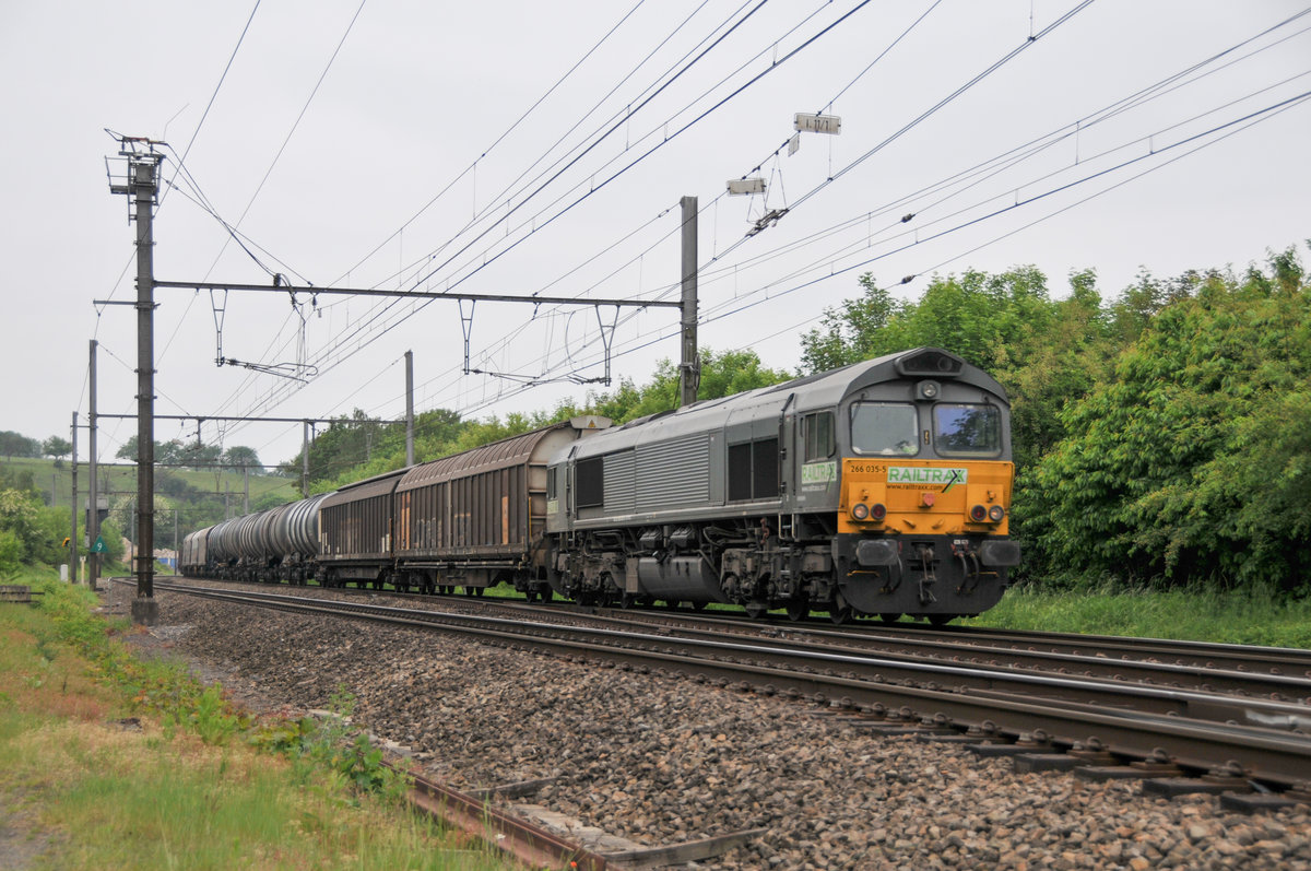 ein schönes Bild von der Class 66 266 035 von Railtraxx mit einem gemischten Güterzug.