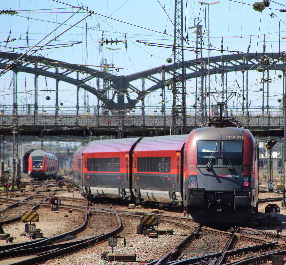 1116 213 schlängelt sich mit dem RJ 67 (München Hbf - Budapest-Keleti) durch das Gleisvorfeld vom Hauptbahnhof München. München Hbf, 13. August 2016 (zum Bild)
