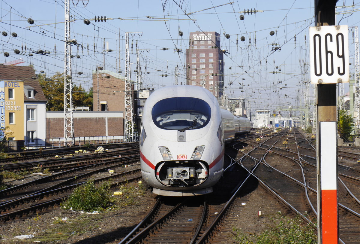 403 025 wird als zweiter Zugteil für den ICE 105 nach Basel in Gleis 6 des Kölner Hbf bereitgestellt. Die Kupplung ist schon für die Verbindung mit dem Zugteil aus Dortmund geöffnet (30.10.16). (zum Bild)