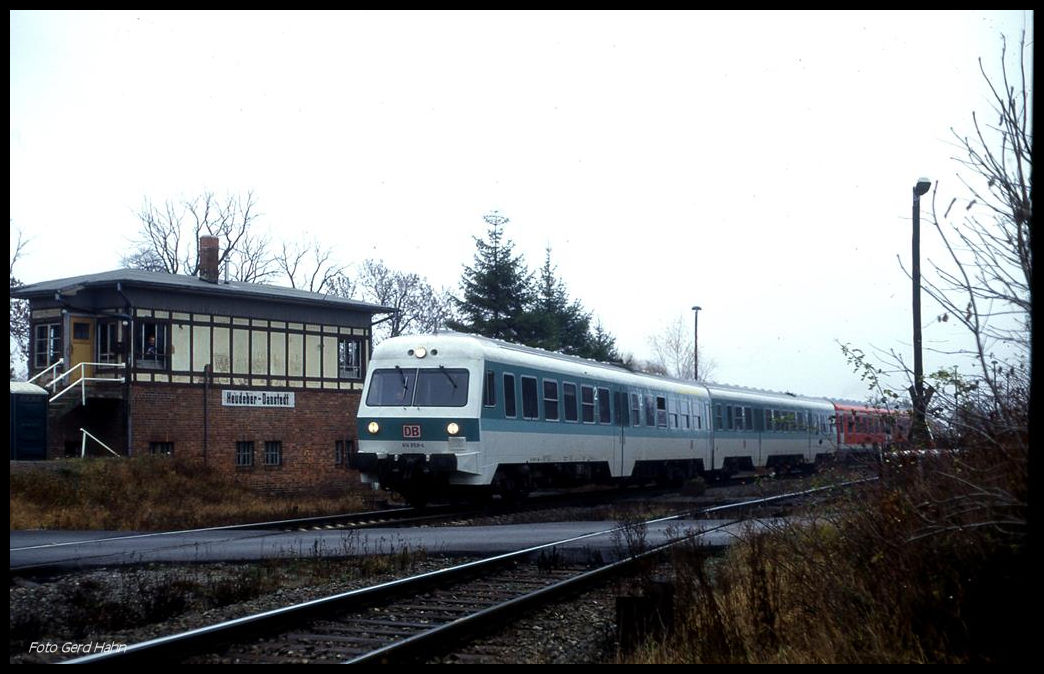 614059 fährt als RB 5868 am 16.11.1997 um 13.08 Uhr in Heudeber - Danstedt nach Wernigerode ab. (zum Bild)