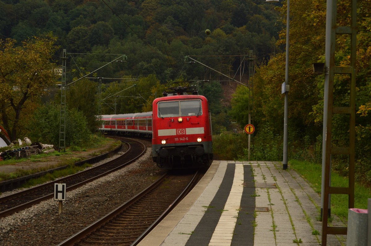 Auch 111 142-6 kommt mit einem RE3 nach Heilbronn im Gegengleisbetrieb durch Neckargerach gefahren am heutigen Nachmittag des 14.10.2016 (zum Bild)