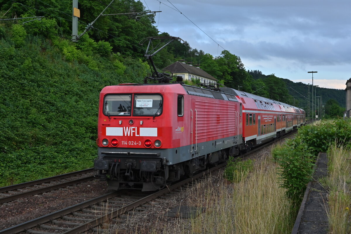 114 024-3 schiebt den RE10a von Neckarelz nach Heilbronn aus Neckarzimmern am 24.6.2021 (al imagen)