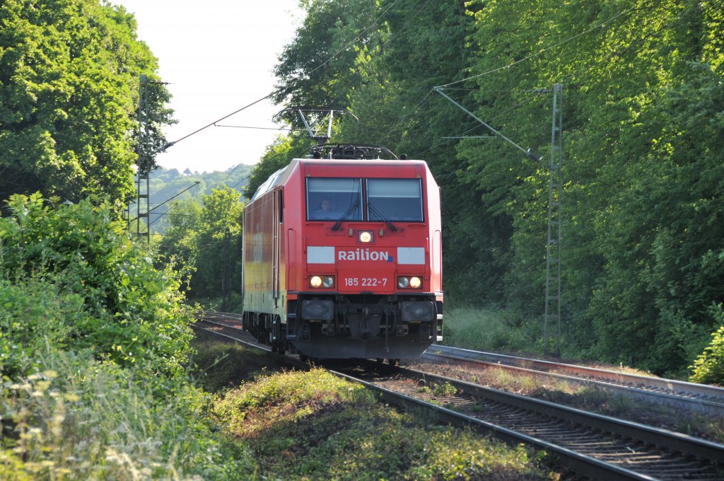185 222-7 hat einem schweren Güterzug in der Steigung bis zum Gemmenicher Tunnel Schubhilfe geleistet, und kehrt nun solo wieder zurück nach Aachen-West. Aufgenommen am 01/06/2011. (zum Bild)