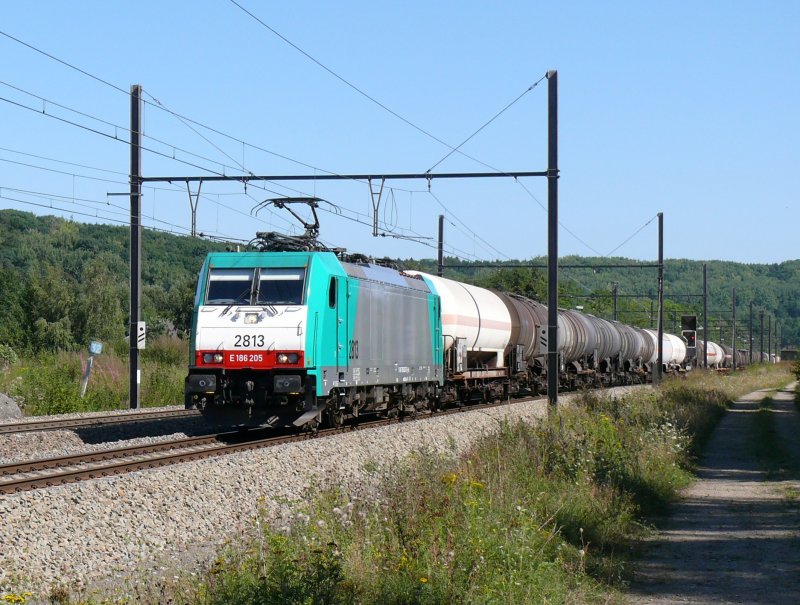 Cobra-Lok 2813 mit einem Kesselwagenzug von Aachen-West kommend kurz hinter dem Viadukt von Remersdael. Aufgenommen am 23/08/2009. (zum Bild)