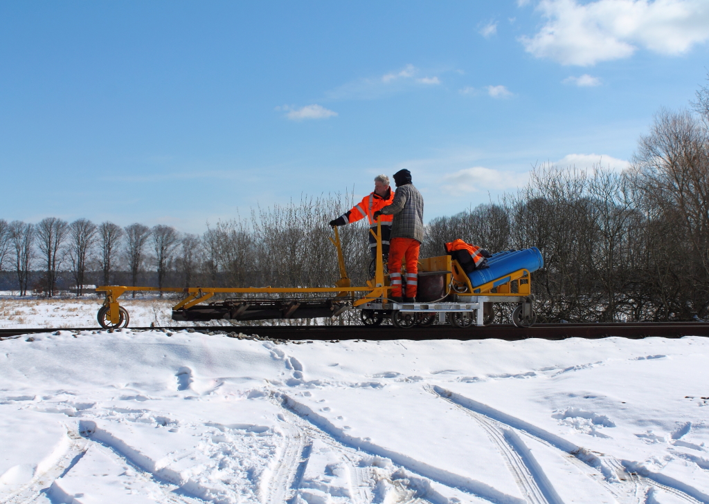 Da wird der Sonne noch etwas nachgeholfen. Mit einem Flammwagen werden die Schienen in mehreren Durchläufen erwärmt. So gesehen in Nassenheide am 13.03.2013. (zum Bild)