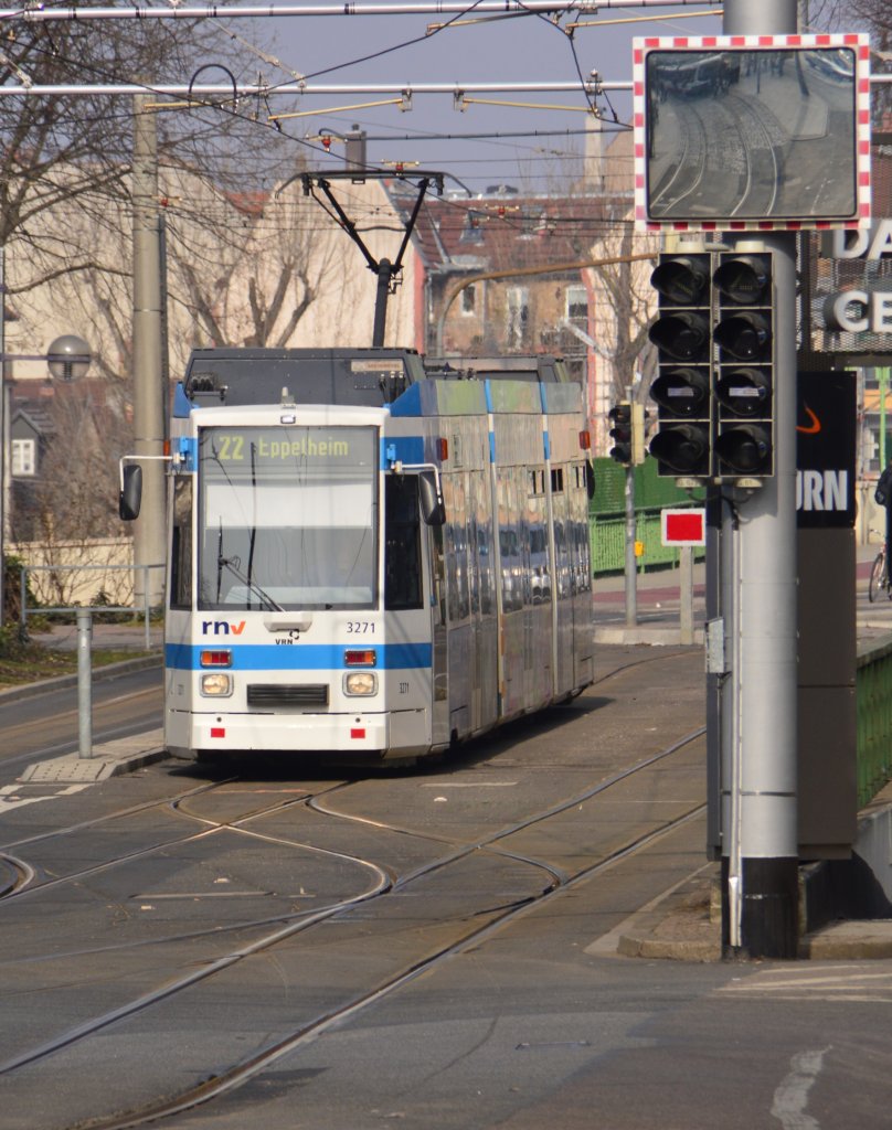 Der Straßenbahnwagen 2371 des vrn auf der Linie 22 in Heidelberg unweit des Bismarkplatzes. 3.3.2013 (zum Bild)